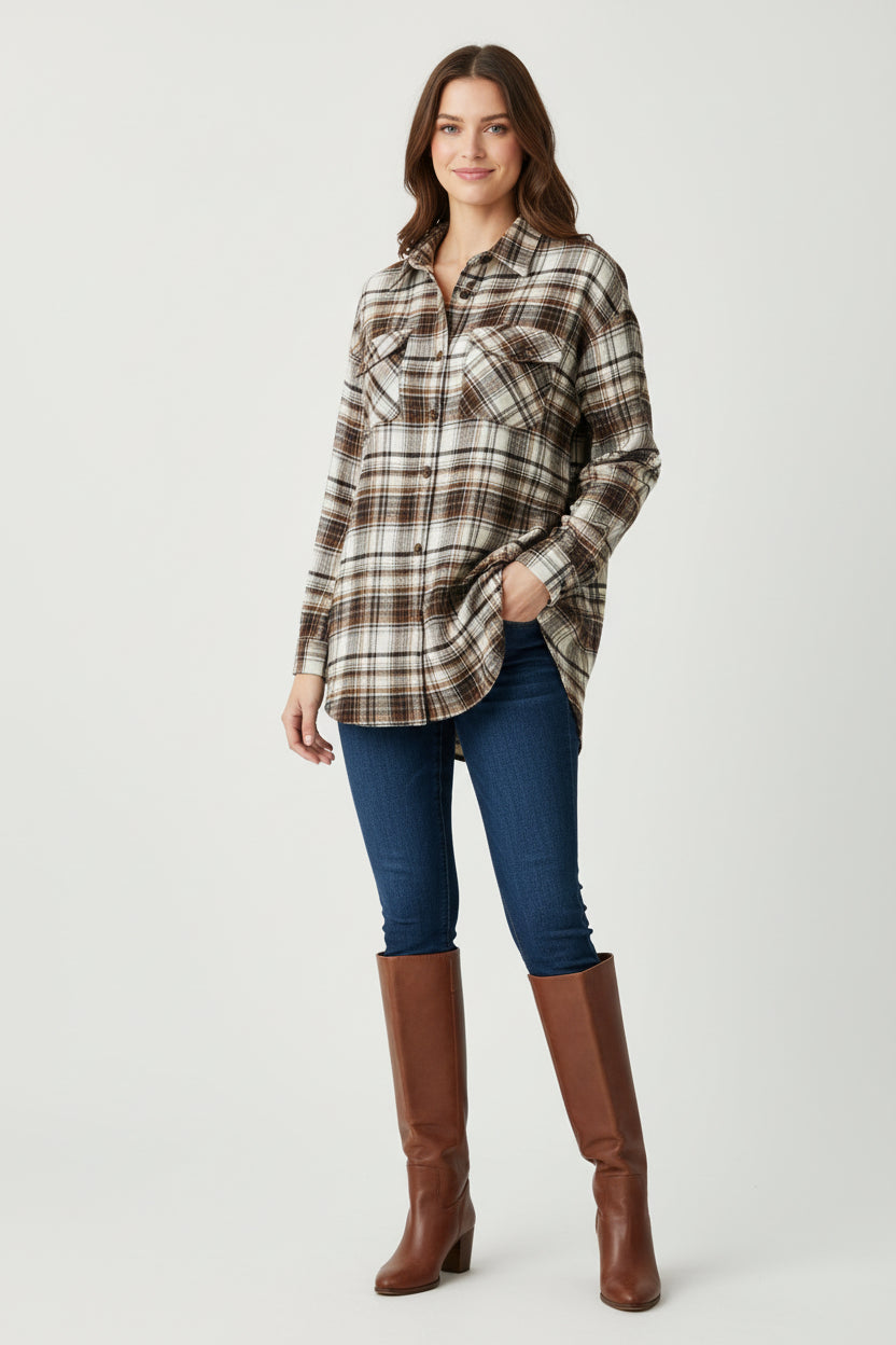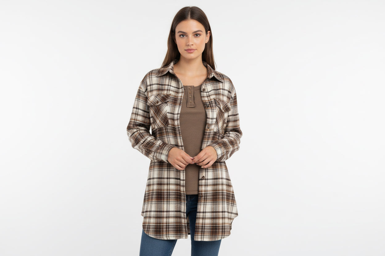 Elevate your wardrobe with this versatile brown plaid button-up from Emma and Grace. Perfect for layering over your favorite tee or wearing solo, this piece effortlessly transitions from casual to polished. The timeless plaid pattern and rich brown tones make it a go-to staple for creating endless outfit combinations. Whether you're dressing up for the day or keeping it relaxed, this button-up delivers both comfort and style that works harder than you think.