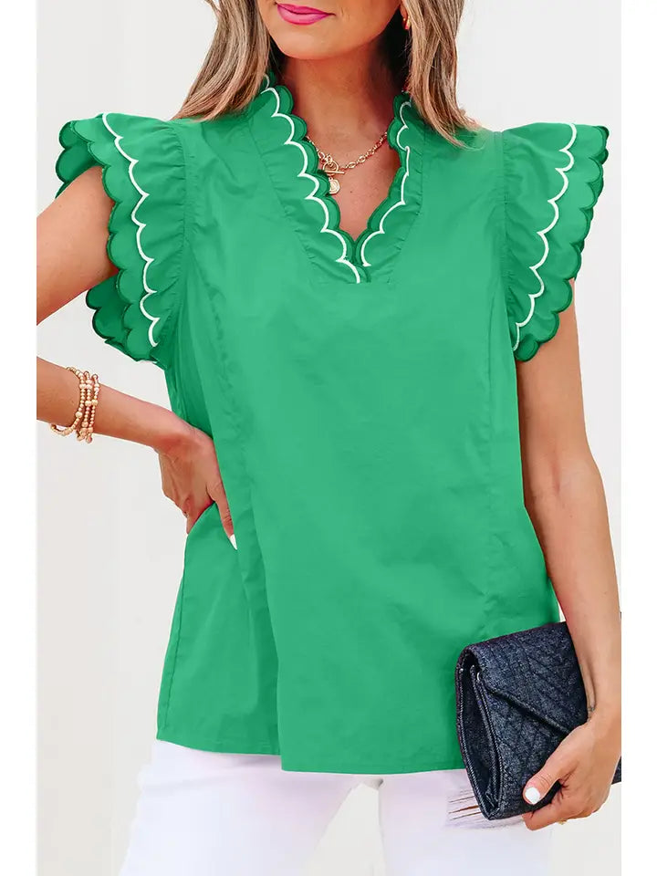 Elevate your everyday style with our Bali Scalloped Trim Ruffle Sleeve Top—a fresh take on casual comfort. Crafted from 100% pure cotton, this lightweight beauty features charming ruffle sleeves that add just the right amount of flair to any outfit. Perfect for warm weather adventures or laid-back days at home, it's breathable, soft, and effortlessly chic.