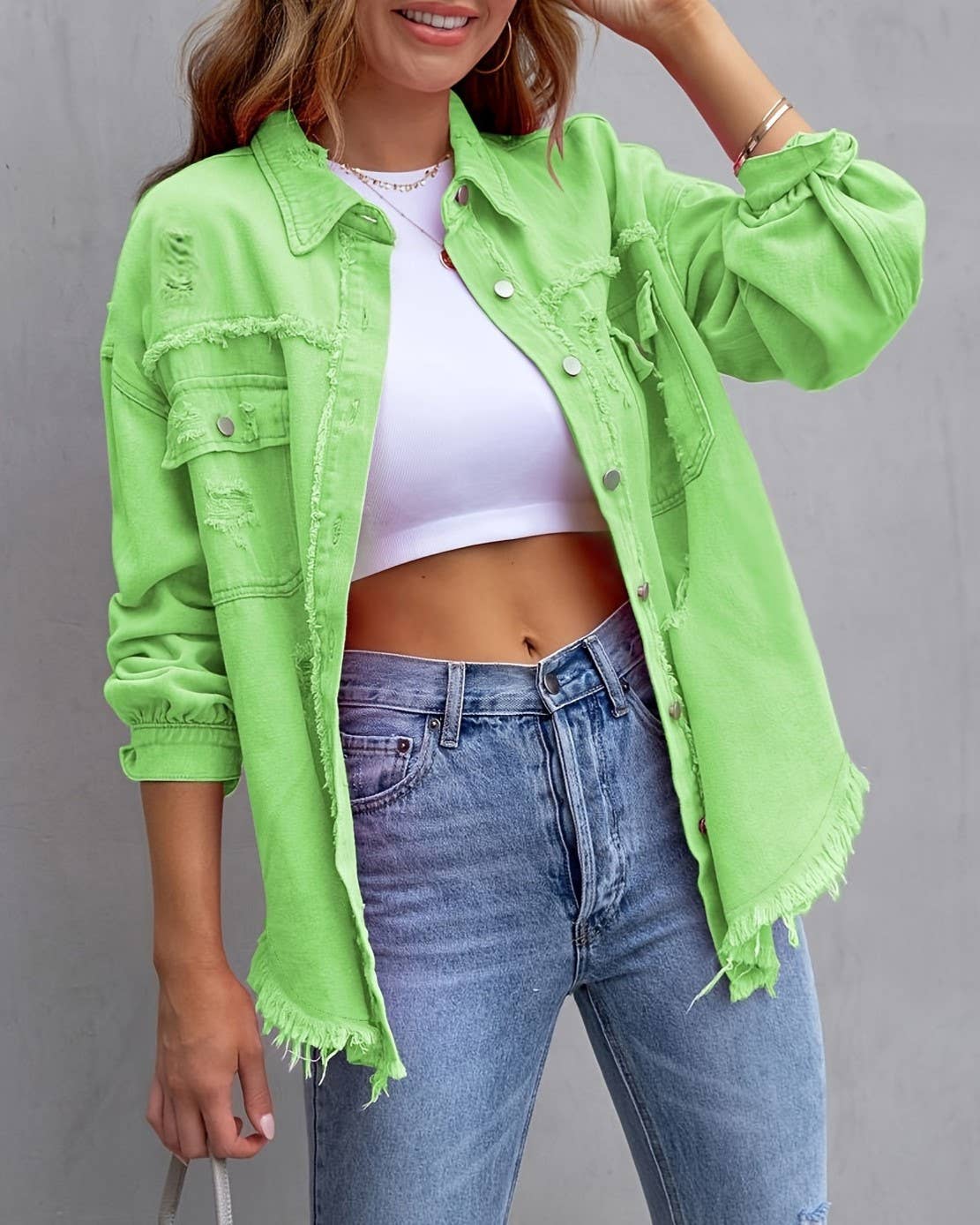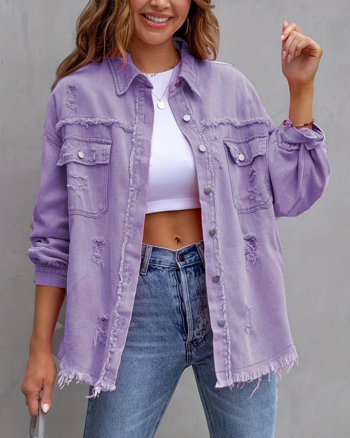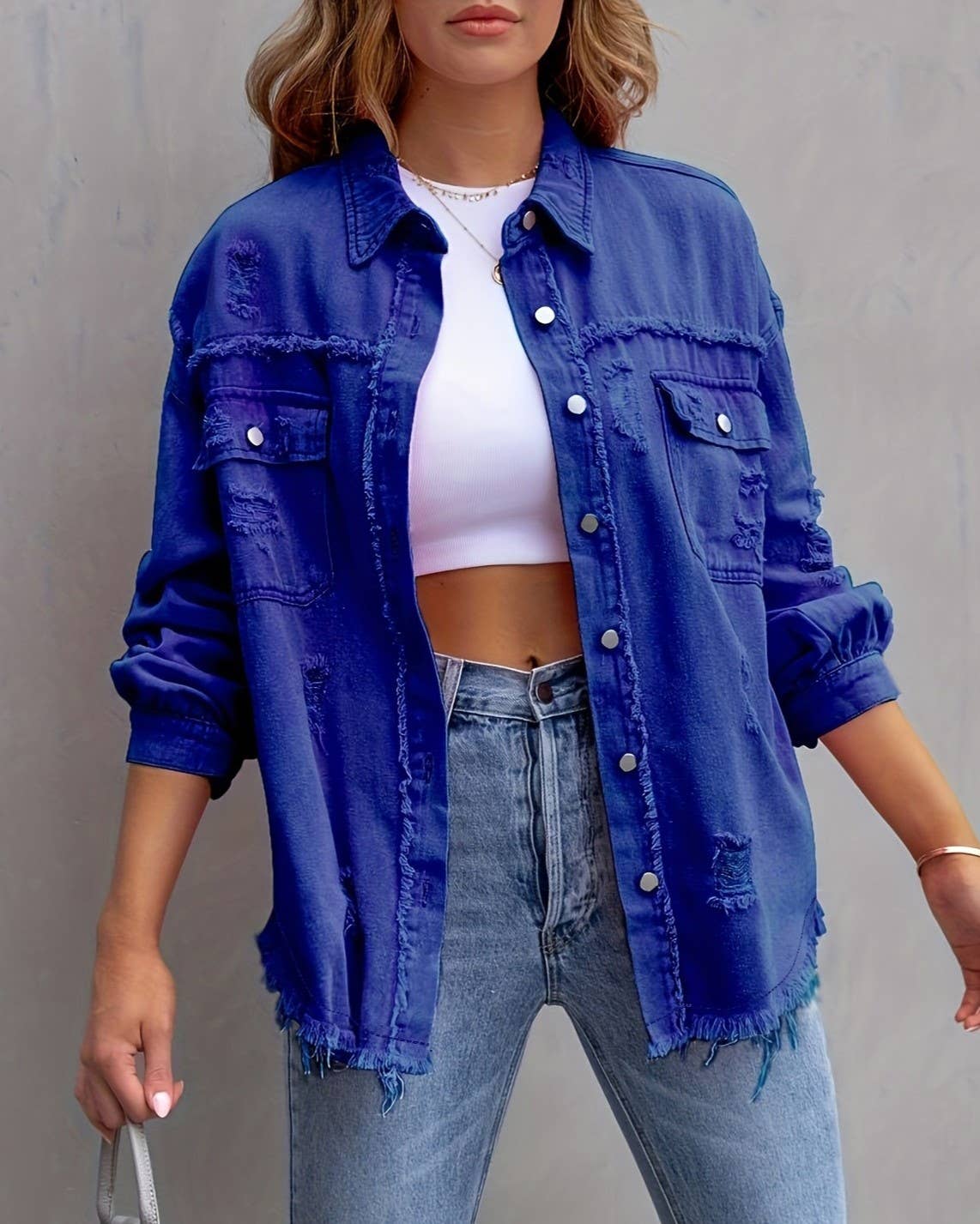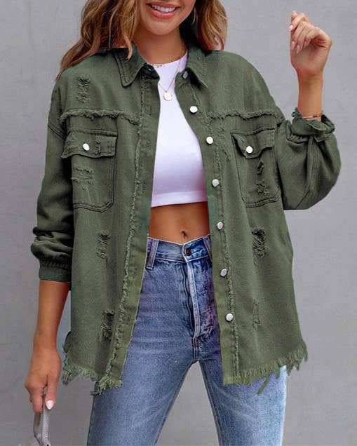 Elevate your casual wardrobe with the Scarlet Threads, a striking red distressed button-up jacket that commands attention. The intentional distressing adds edgy character and modern flair, while the classic button-front design keeps it versatile enough for layering or wearing solo. Perfect for creating bold, effortless looks that transition seamlessly from day to night. Whether you're dressing up basics or adding attitude to your ensemble, this statement piece delivers the perfect balance of rugged style and refined appeal.