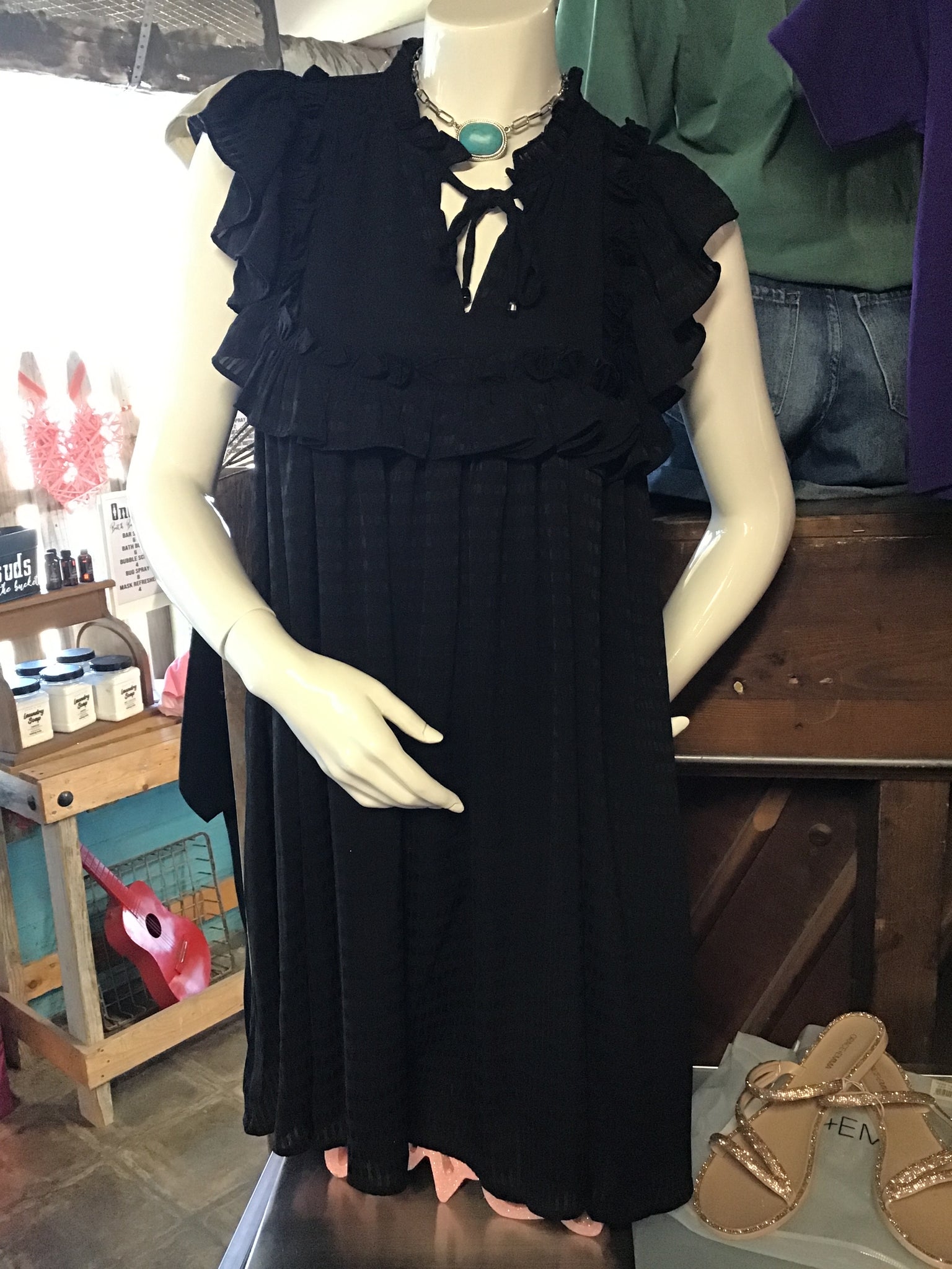 Elevate your everyday style with the Sideline Social—a chic black ruffle sleeveless dress that breaks the mold. Layer it over leggings for an effortlessly polished look that transitions seamlessly from casual outings to social gatherings. The delicate ruffle detailing adds feminine flair while the sleeveless silhouette keeps things modern and versatile. Whether you're dressing it down with sneakers or up with heels, this piece becomes your go-to for creating multiple outfits from one wardrobe essential. Comfortable, stylish, and endlessly adaptable.